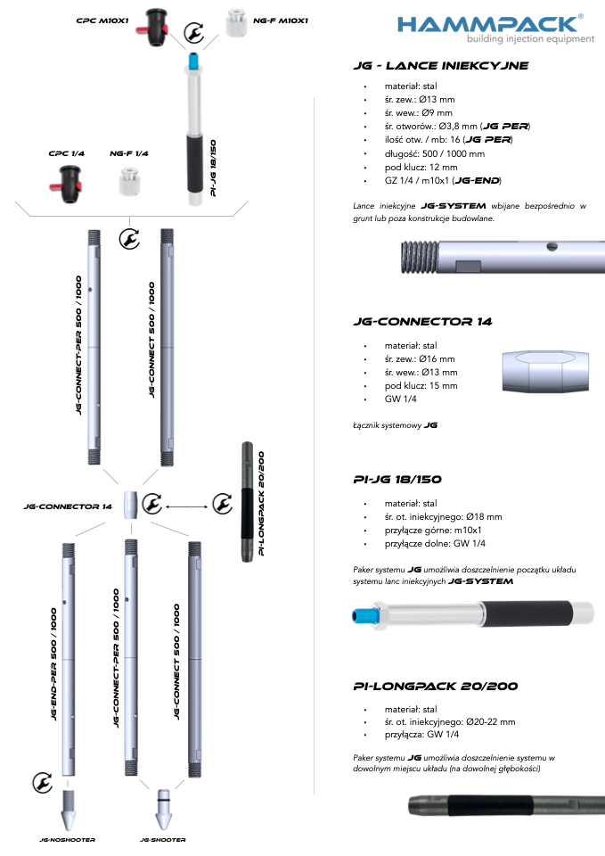 Lance iniekcyjne systemu Hammpack JG-SYSTEM, o długościach odcinków pełnych i perforowanych 500mm i 1000mm. Wyważona struktura powierzchni iniektowania zarówno dla suspensji cementowych, geopolimerów, żeli akrylowych i żywic poliuretanowych.