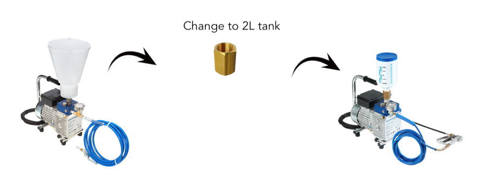 Smaller capacity means less resin, thus lower viscosity of the injected resin and longer processing time. The lockable container limits the access of dirt and moisture to the pump.